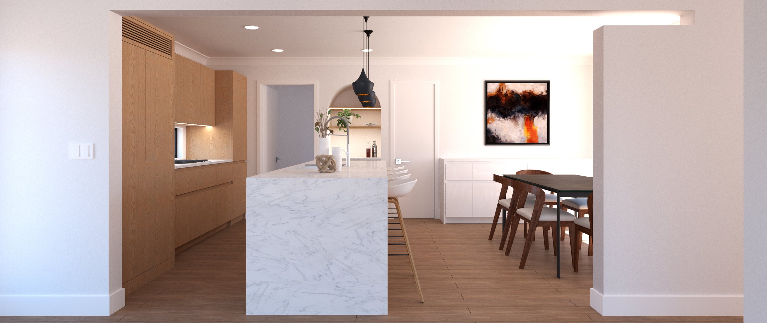 The scope of this project was a re-imagining of a kitchen/dining area and how it can be reconfigured to integrate more seamlessly with the adjacent spaces. This included relocating the Kitchen itself to the opposite end of the space, while creating a more open plan layout around it. This allows for more light to enter the space, and creates a much stronger connection with the adjacent front entry, corridor, and living area.